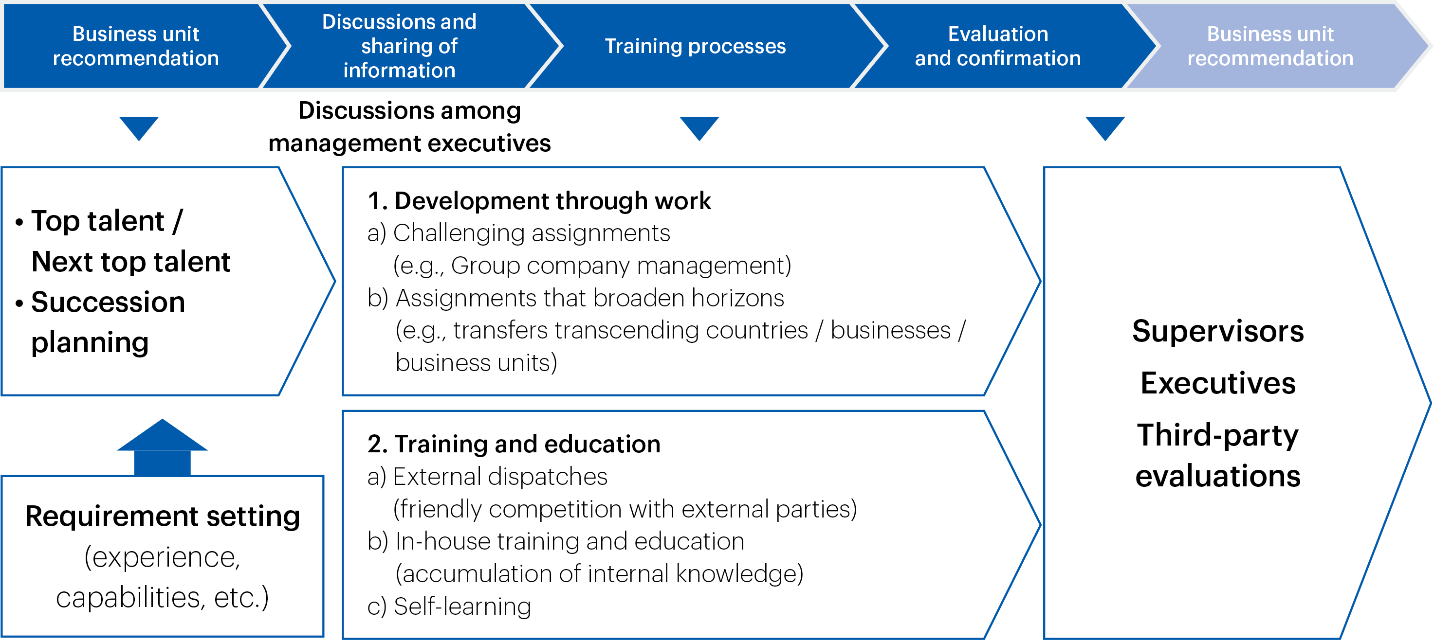 We also engage in various initiatives to achieve the optimal global placement of human resources. We are, for example, developing a Groupwide platform to centrally visualize human resource information from across the globe and standardizing policies on employee compensation, transfers, and assignments, thereby establishing a foundation for human resource utilization that transcends national and regional boundaries.