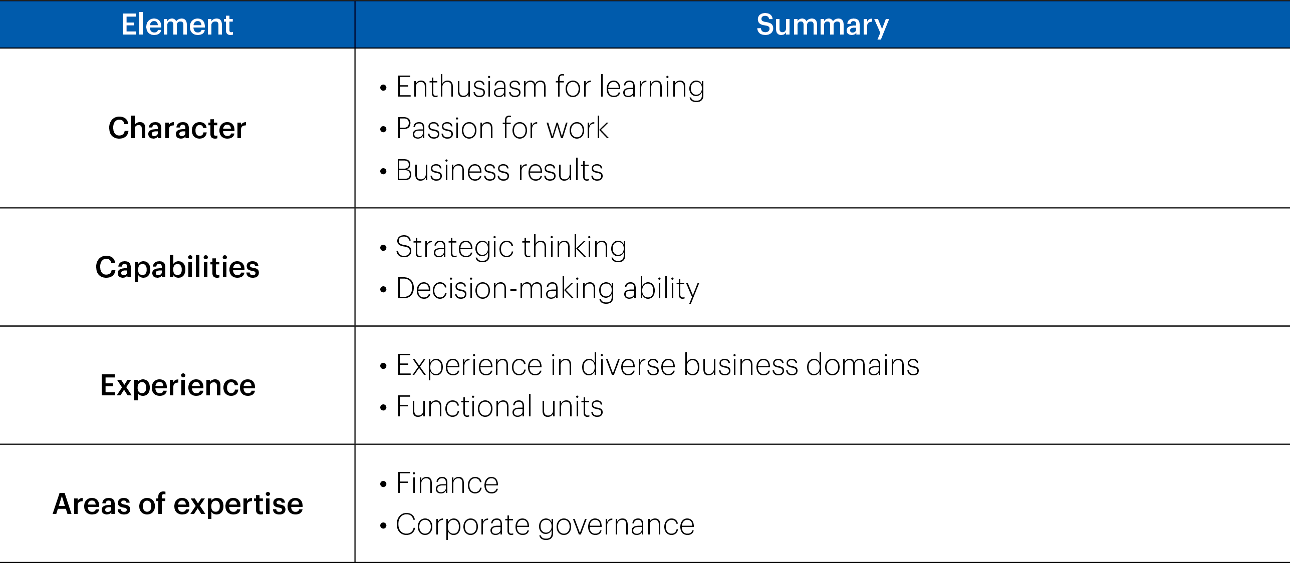 The Mitsubishi Chemical Group’s global workforce consists of approximately 60,000 people with diverse knowledge and experience, from among whom we promote measures to select, develop, and appoint candidates for the next generation of leaders who will drive our business into the future. We have thus redefined the talent requirements for leadership roles, created a pool of potential candidates, and formulated and implemented individual career development plans based on discussions among management executives, aiming to build a robust talent pipeline.