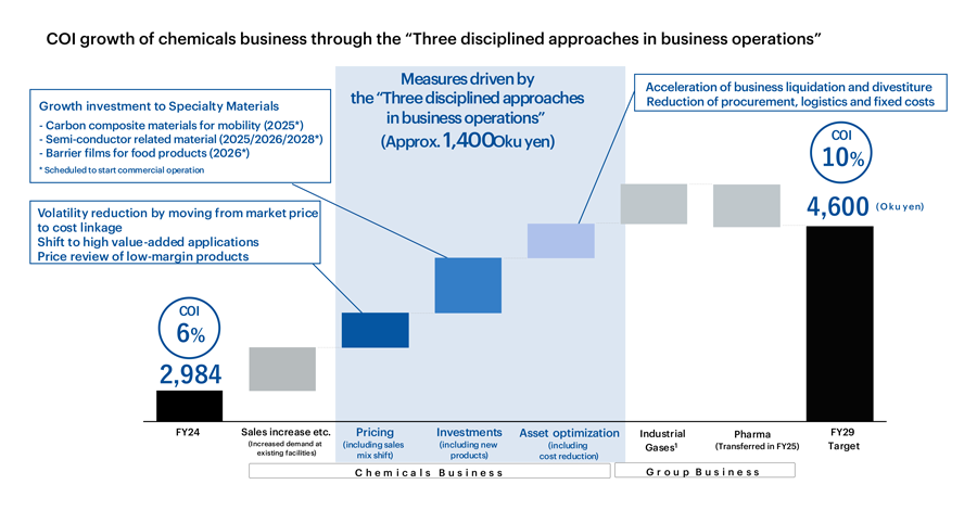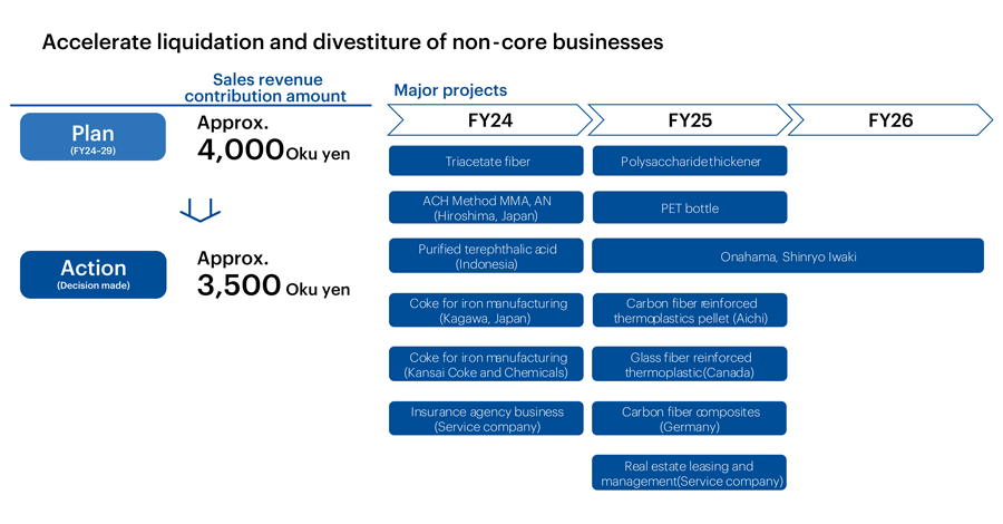 Under New Medium-Term Management Plan 2029, we expect to incur restructuring costs equivalent to around ¥400.0 billion in sales revenue in the Chemicals Business, of which approximately ¥350.0 billion has already been determined as of August 1, 2025. We have undertaken several business restructuring measures, including reducing capacity by 40% at our steelmaking coke plant in Kagawa Prefecture, transferring all shares of Kansai Coke and Chemicals Company, Limited, closing down our plants in Hiroshima Prefecture for MMA monomer and acrylonitrile-related products, and withdrawing from the PET bottle business. Production at the Onahama Plant in Fukushima Prefecture will also be phased out by the end of March 2027.