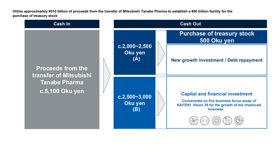 Of the approximately ¥510.0 billion in consideration for the transfer, ¥200.0 billion to ¥250.0 billion (“A” in the chart) will be allocated to new growth investments, debt repayments to improve our financial position and secure borrowing capacity for future strategic investments, and shareholder returns through treasury share acquisitions.* The remaining ¥250.0 billion to ¥300.0 billion (“B” in the chart) will be used for concentrated capital and financial investments in the five business focus areas of KV35 necessary for the growth of the Chemicals Business, as set forth in Medium-Term Management Plan 2029.