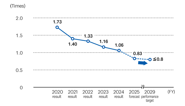 At present, we believe a net debt-to-equity ratio of 0.8 times to be a sound and appropriate level for the Group. In fiscal 2025, we expect our net debt-to-equity ratio to approach this level, improving to 0.83 times through the acquisition of treasury shares and debt repayments. Sustaining this level through to fiscal 2029—the final year of Medium-Term Management Plan 2029—is one of our financial goals. We will utilize borrowings as appropriate while keeping our cost of capital in mind and maintain an optimal asset size commensurate with revenue and profits. We believe that striking a balance between debt and equity will lay the foundation for sustainable management.