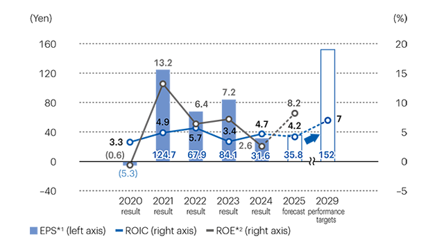 *1 EPS calculation excludes the profit of discontinued operations. Following the resolution of the transfer of Mitsubishi Tanabe Pharma Corporation at the Group’s annual shareholders’ meeting, the Pharma Business has been classified as a discontinued operation. Accordingly, the forecast for fiscal 2025 and target for fiscal 2029 exclude this business from the scope of earnings per share (EPS) for continuing operations. EPS for the fiscal year ended March 2025 calculated with this exclusion is (1.7) yen.