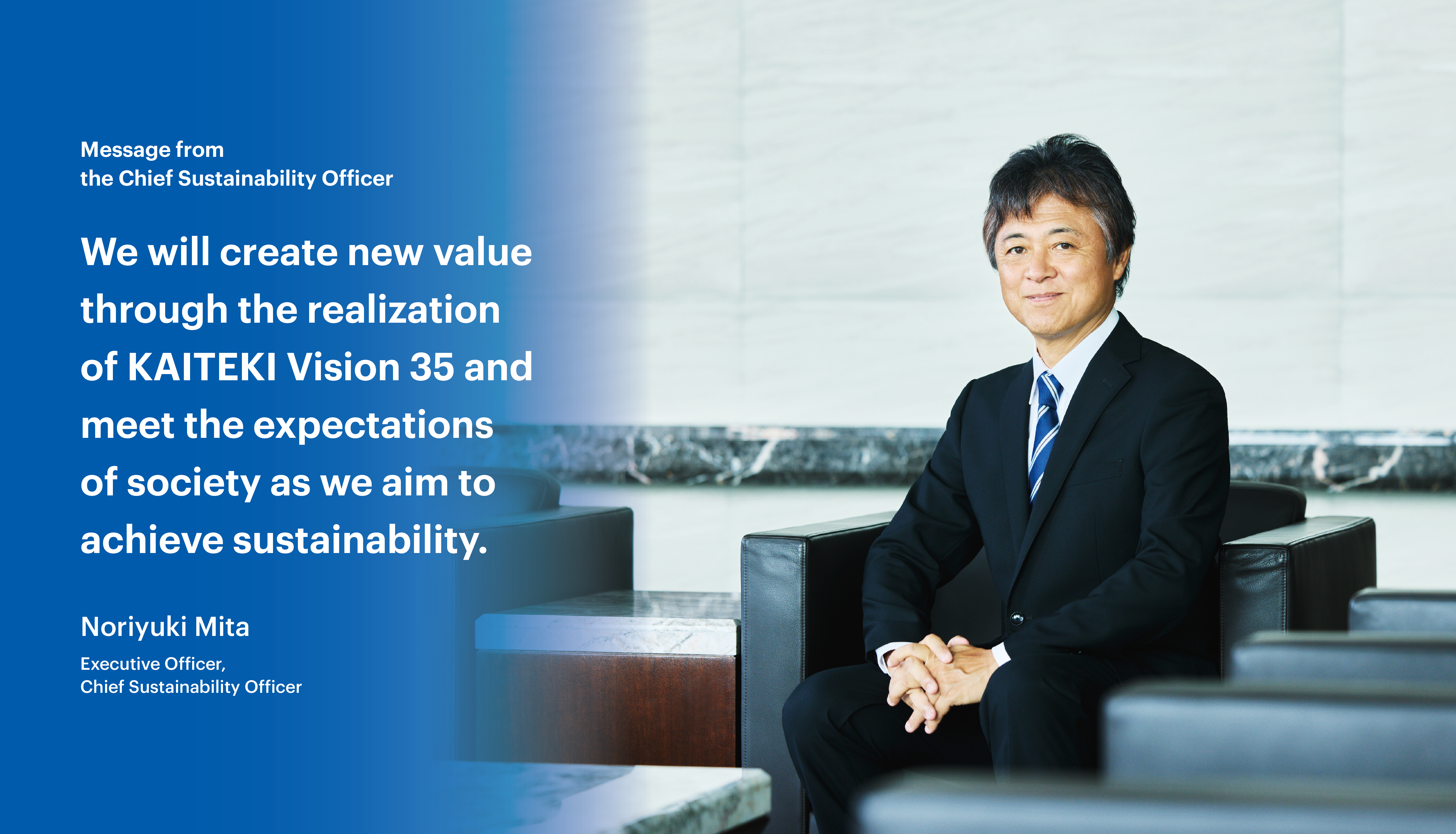 At the Mitsubishi Chemical Group, our Purpose is to “lead with innovative solutions to achieve KAITEKI, the well-being of people and the planet.” This concept “KAITEKI” is deeply connected to sustainability and has been rooted in our employees around the world as a way of thinking and a guiding principle, having become a solid foundation for realizing sustainability since it was announced in 2011. Meanwhile, the external environment is changing at an astonishing pace and society’s expectations for the role we must fulfill are becoming even greater.