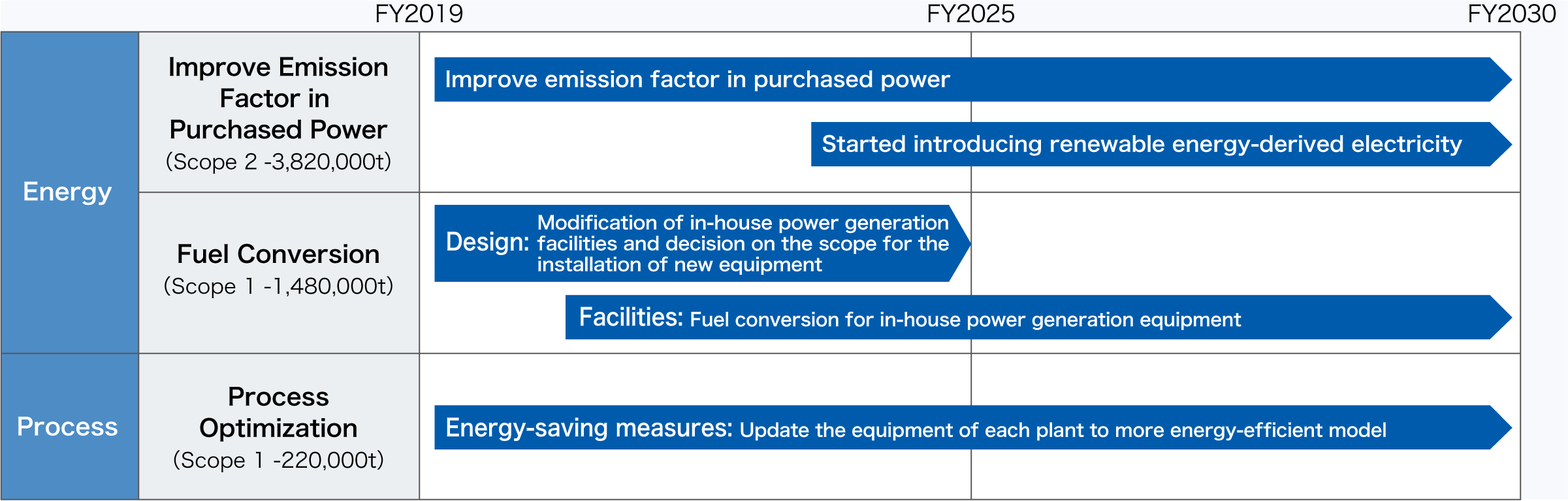 We believe that reducing the emission factor for purchased electricity will make the greatest contribution to achieving our emission reduction target by fiscal 2030. This is based on the introduction of renewable energy sources, along with the reduction in the emission factors being carried out by power companies every year. We plan to secure this supply of renewable energy power ahead of fiscal 2030. Additionally, we are already working on designs for fuel conversion, particularly for coal-fired power plants, and some of these actions are already underway. Furthermore, we are streamlining our manufacturing processes.
