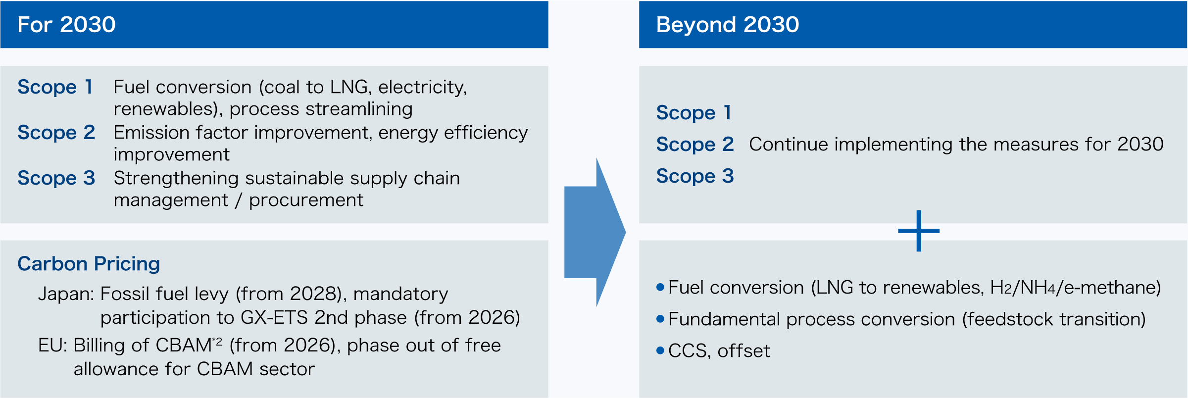 Looking to fiscal 2050, we will maintain our actions up to 2030, while also working on fuel conversion by utilizing hydrogen, ammonia, and e-methane at the appropriate time, reducing process-related emissions by switching raw materials, and CCS*1.