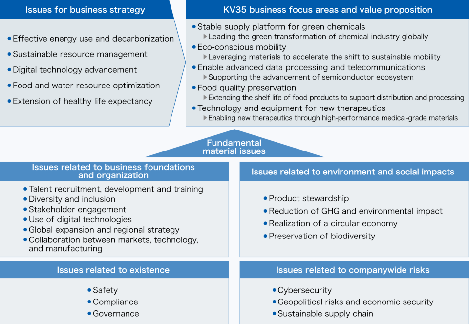 | Discussion on Classification and Structuring of Material Issues | The selected candidates for material issues were then discussed internally in light of the policies and actions of the medium-term management plan, to identify the final material issues. The Group classified material issues from the perspectives it considers important, such as business strategy, business foundations, and impact on the environment and society. |