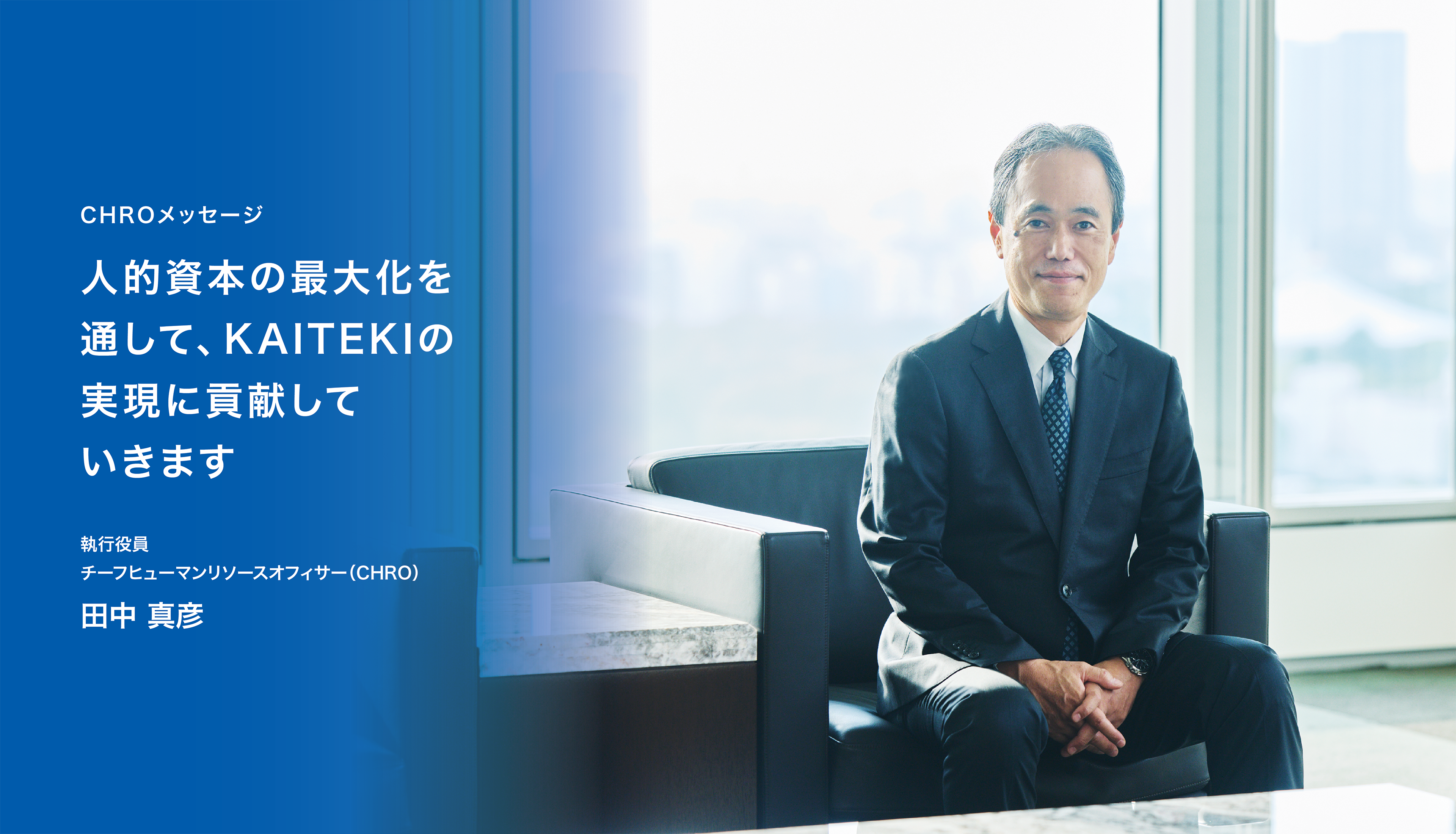 私たちは今、先行きを見通しづらい不確実で変化の速い時代を生きています。だからこそ、私たちがめざすべき北極星として「KAITEKI」という「Purpose」を大切にしています。そして、人的資本を最大化し、その力を推進力として最大限活用することを通してPurposeの実現に貢献することが、CHROである私の最重要課題です。
