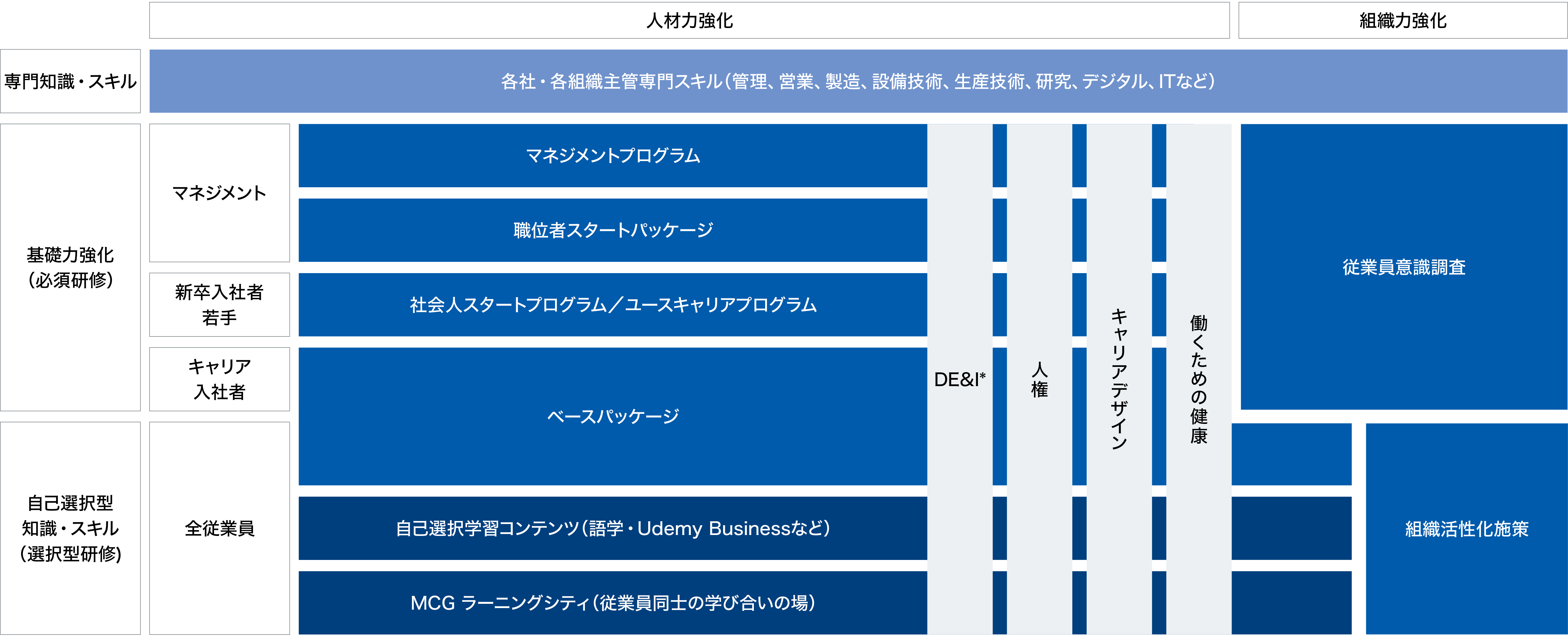 従業員一人ひとりの成長を支援するための育成体系を整備しています。新卒やキャリア採用者に対して、社会人としての基本的なスキルに加え、円滑に業務を開始し、活躍の場を広げるための基礎づくりとして、社内知識の習得や交流の機会などを提供しています。また、新任管理職層から職位者まで、各マネジメント層が段階的にスキル・知識・マインドを身につけられるよう、マネジメントプログラムを通じて支援しています。これにより、目標達成に向けて組織やチームを率いて、メンバーが最大限の力を発揮できる環境づくりを推進しています。