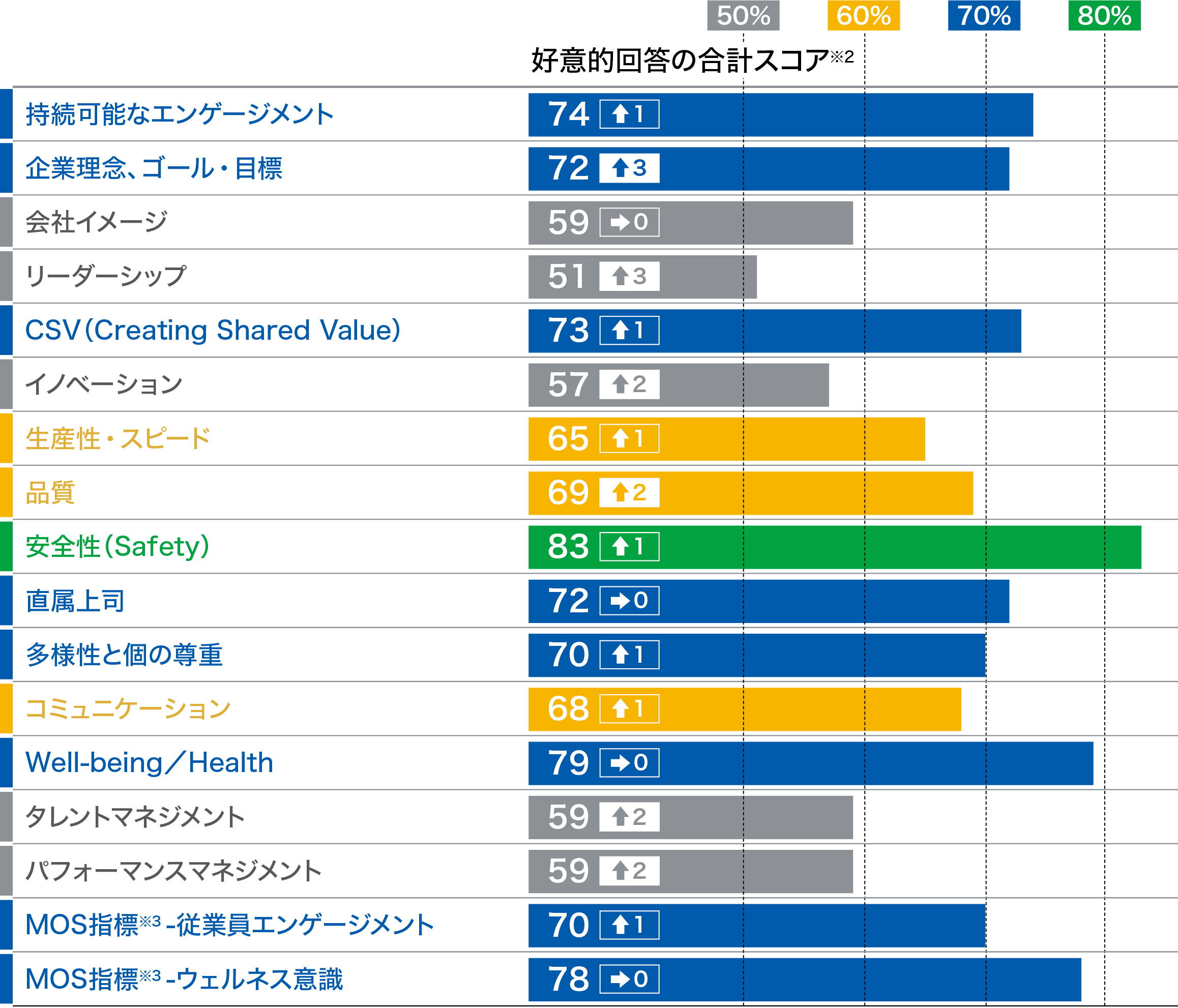 従業員が自身の所属する組織の方針、風土、職場環境、キャリア機会等をどのように考えているかを把握するため、グローバルで定期的に従業員意識調査を実施しています。調査結果は、組織単位でのフィードバックや要因分析、好事例の水平展開などに活用されており、各部署における強みや課題の把握、改善策の実行を通じて、従業員と会社の関係性をより良いものにしていくことを目指しています。