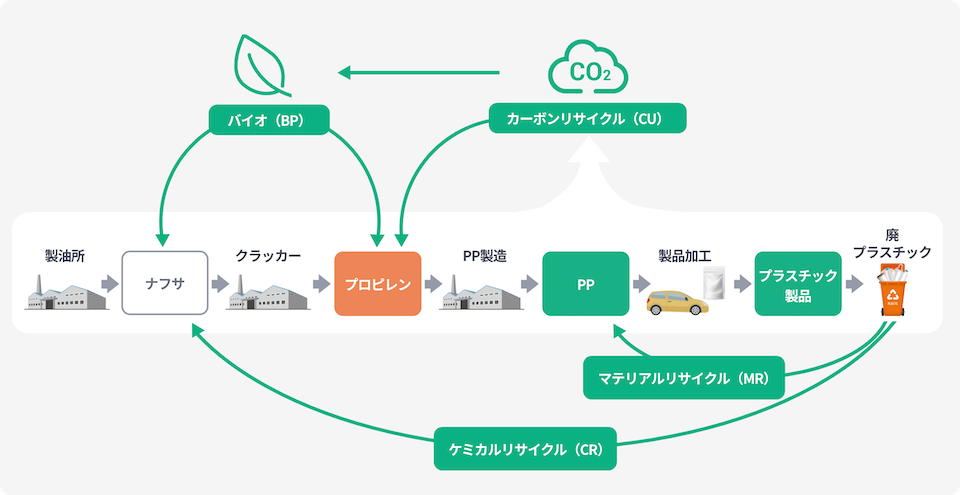 市場分析や顧客への価値提案を通じて、『ノバオルビス™』を社会に広く普及させるための認知拡大に取り組んでいます。『ノバオルビス™』は、市場から回収したポリプロピレンをそのまま原料として再利用する「マテリアルリサイクル」に加え、回収したプラスチックを一度油に戻して活用する「ケミカルリサイクル」、CO2を原料として活用する「カーボンリサイクル」、バイオナフサ等から得られる「バイオポリプロピレン」など、複数のアプローチを展開しています。