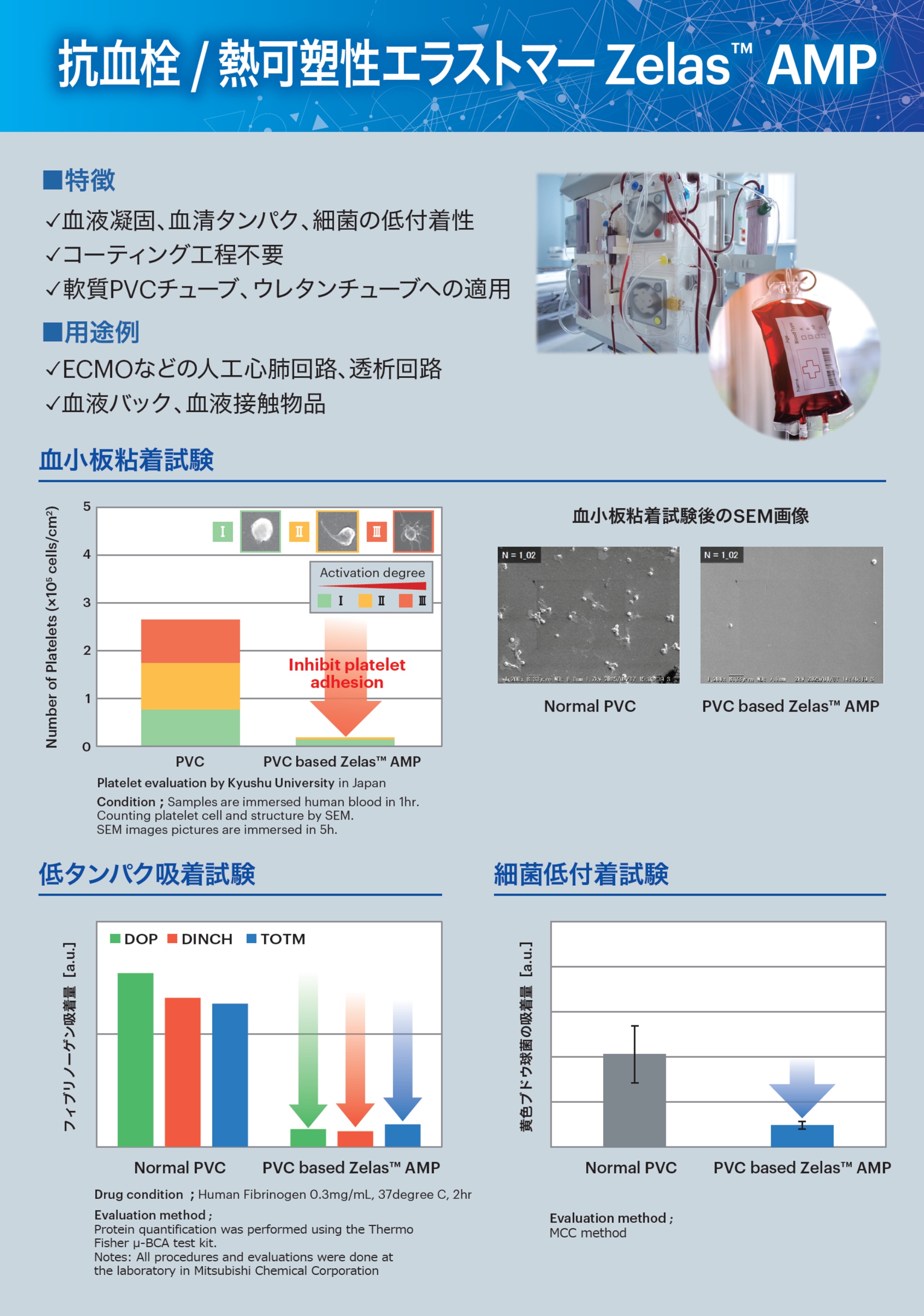 当社は、長年にわたり医療用コンパウンド樹脂「Zelas™」の高度な配合・コンパウンド技術を蓄積し、医療用素材の供給体制をグローバルに拡充してきました※。このたび当社が独自開発したZelas™ AMPのキーポリマーは、親水性構造由来の血液適合性と疎水性構造由来の基材親和性を兼ね備えた両親媒性ポリマーです。このZelas™ AMPのキーポリマーを医療機器の基材となる樹脂(塩化ビニル、ウレタン、エンジニアリングプラスチックなど)に添加することで、基材に抗血栓性、低タンパク質吸着性、低細菌付着性などを付与することができます。