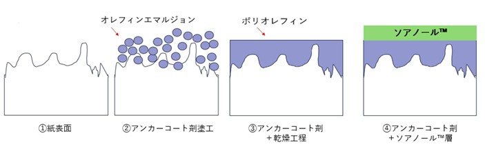 このたび当社が開発した技術は、紙基材にソアノール™溶液とアンカーコート剤を併用して塗工することで安定したバリア層を形成し、ソアノール™の優れたガスバリア性や耐油性を付与することができます。