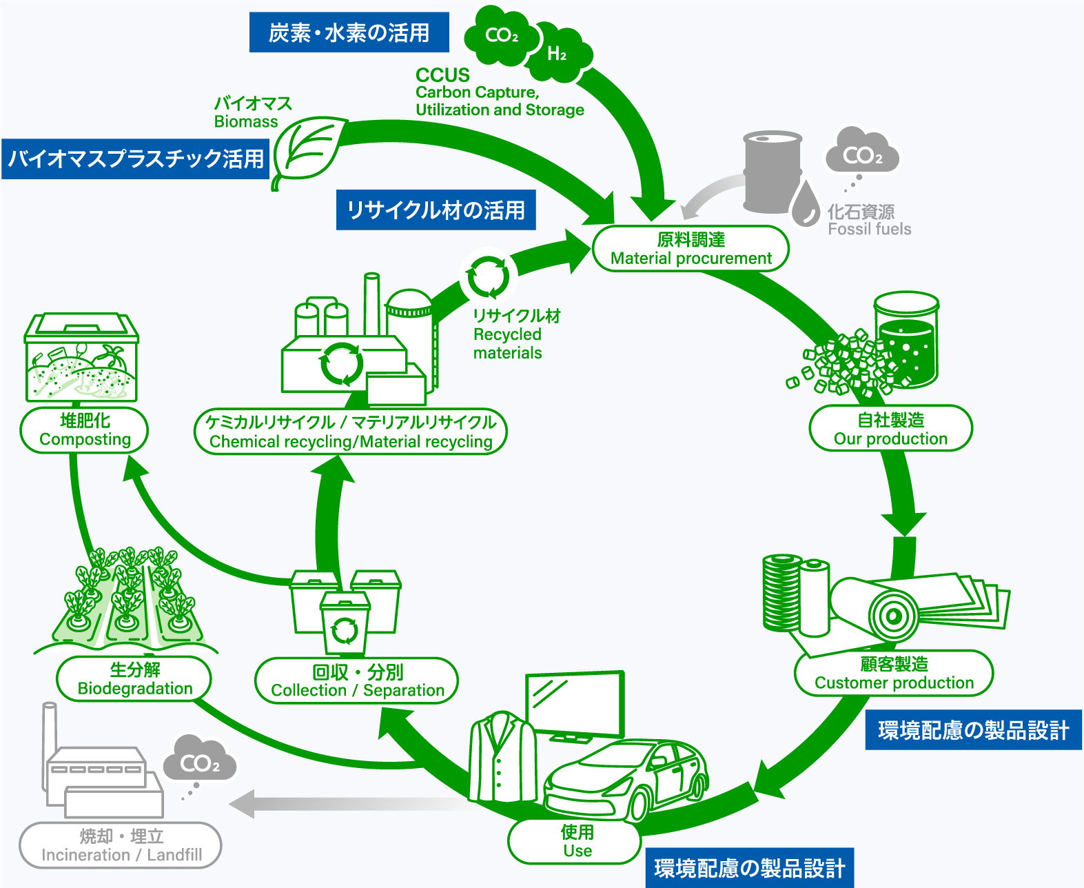 ケミカルリサイクルやマテリアルリサイクルによるプラスチックリサイクル材の提供、バイオマス原料への転換・生分解による炭素循環、使用時のGHG排出量削減に寄与する製品などの拡大により、事業のさらなる成長を図ります。環境インパクトやカーボンフットプリントの定量評価の際には、 LCAを活用し、研究開発、製造、製品提案などさまざまな場面で環境負荷低減の取り組みを先導しています。さらに、オープンイノベーションやステークホルダーとの連携による循環システムの構築を通じて、より快適で安心な暮らしと地球環境へ貢献する循環型社会の実現に向けた取り組みを推進しています。