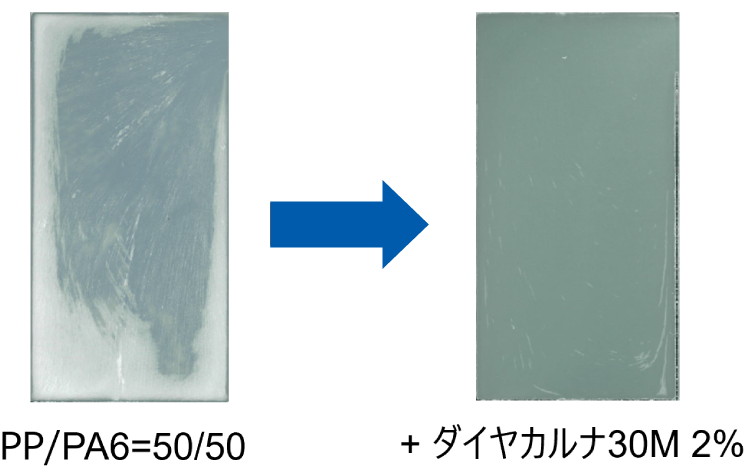- リサイクル材による物性低下を抑制することが可能です。また、異樹脂の相容化による分離困難なプラスチックの再利用にも貢献します。