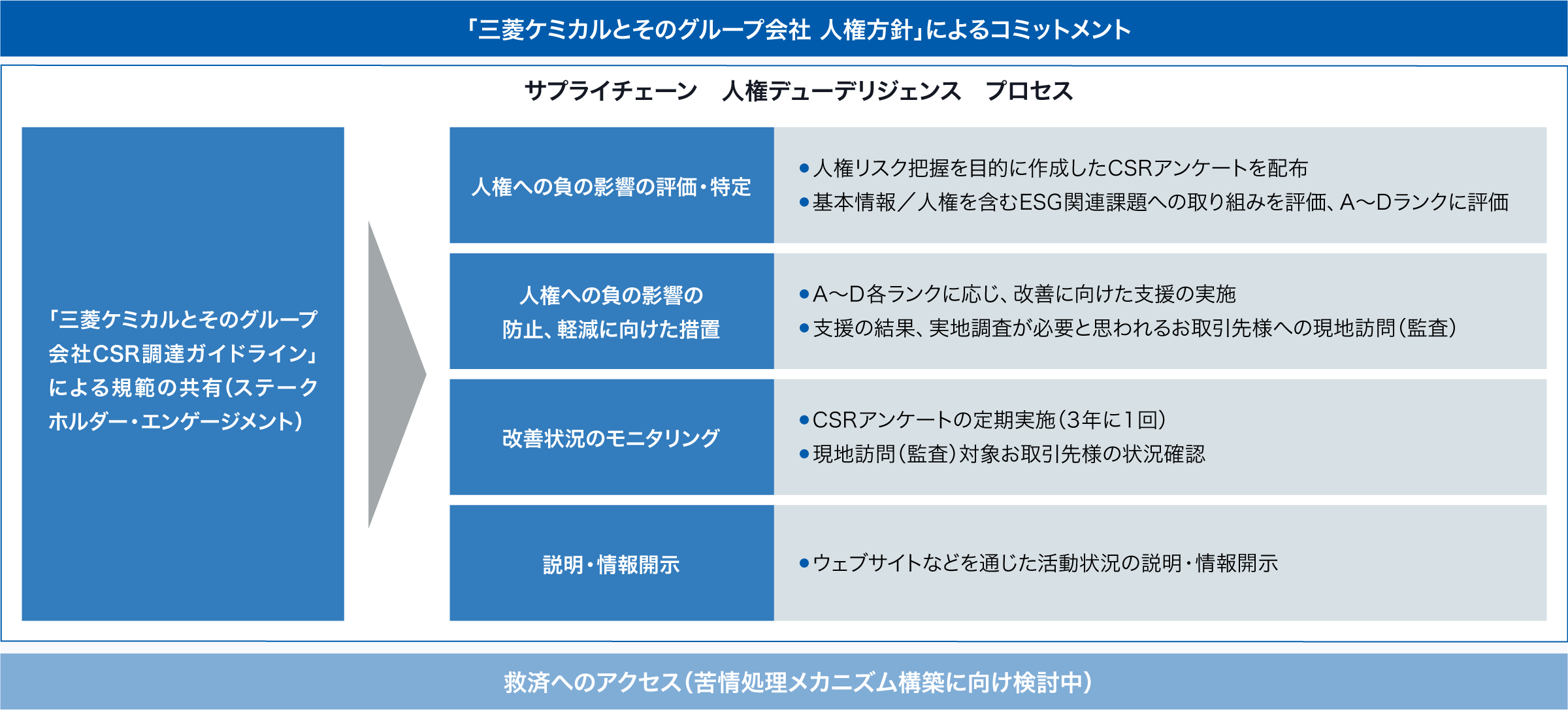 三菱ケミカルグループは、「三菱ケミカルグループ企業行動憲章」に則り、製品開発から原材料調達、生産、販売、物流、廃棄に至るまでの各段階において、安全性と環境への十分な配慮を行い、CSR調達(持続可能な調達)ならびに持続可能なサプライチェーンの構築に取り組んでいます。